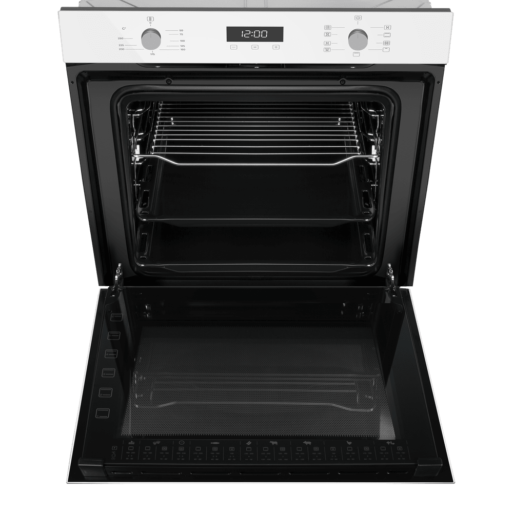Безопасность на кухне поддерживает тангенциальное охлаждение, снижающее нагрев мебели вокруг, и «холодный фронт» с 3 стеклами двери, благодаря которому внешнее стекло практически не греется — удобно и спокойно, даже когда рядом дети. Черное жаропрочное стекло фронтальной панели окрашено по всему объему, подчеркивая премиальный характер модели и делая MAUNFELD EOEM7610W достойным центром современной кухни.